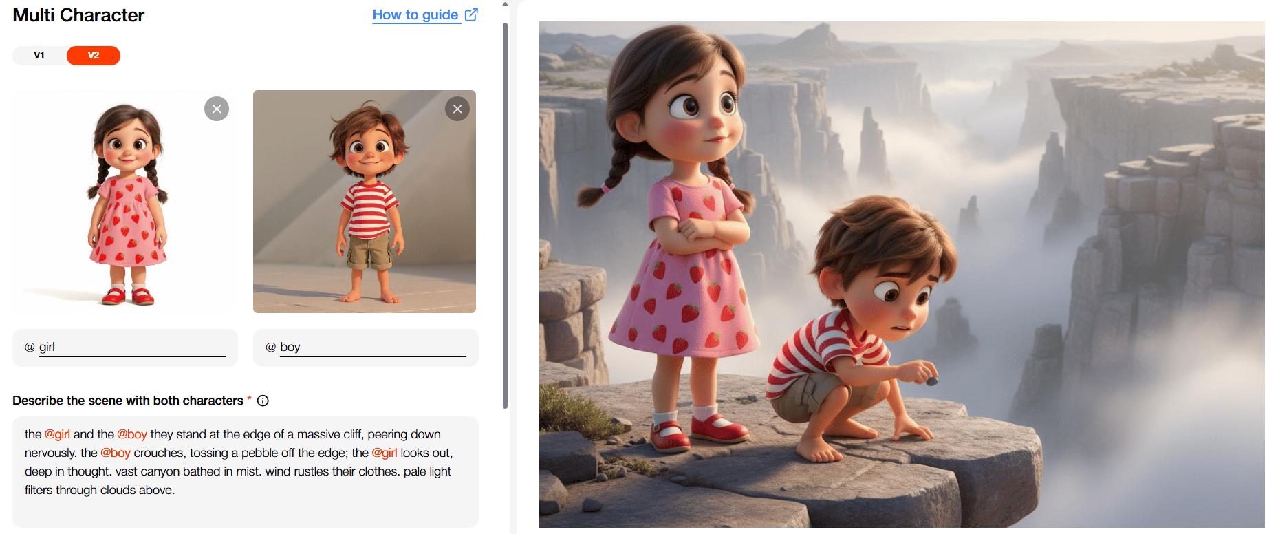 💡 Pro Tip: Layer these editors for complex scenes. Start with base character → change outfit → change background → change action → final scene complete. Each step generates a new image you can further refine. Multiple Character Consistency: The Two-Character Scene MethodCreating scenes with multiple characters? Here's the workflow: Step 1: Create Character 1 (full-body front view) → Download Step 2: Create Character 2 (full-body front view) → Download Step 3: Go to "Multi Character" → Upload both images Step 4: Write your scene using @ tags: "@Girl and @Boy stand at the edge of a massive cliff peering down nervously. The boy crouches, tossing a pebble off the edge. The girl looks out deep in thought. Vast canyon bathed in mist." Key: Be vivid and specific. If you described it to someone, could they visualize it clearly? Critical Prompting Rules (Avoid These Common Mistakes)DO: DON'T: Your Turn: The 15-Minute Challenge with ConsistentCharacter.aiThis week, create your first consistent character: