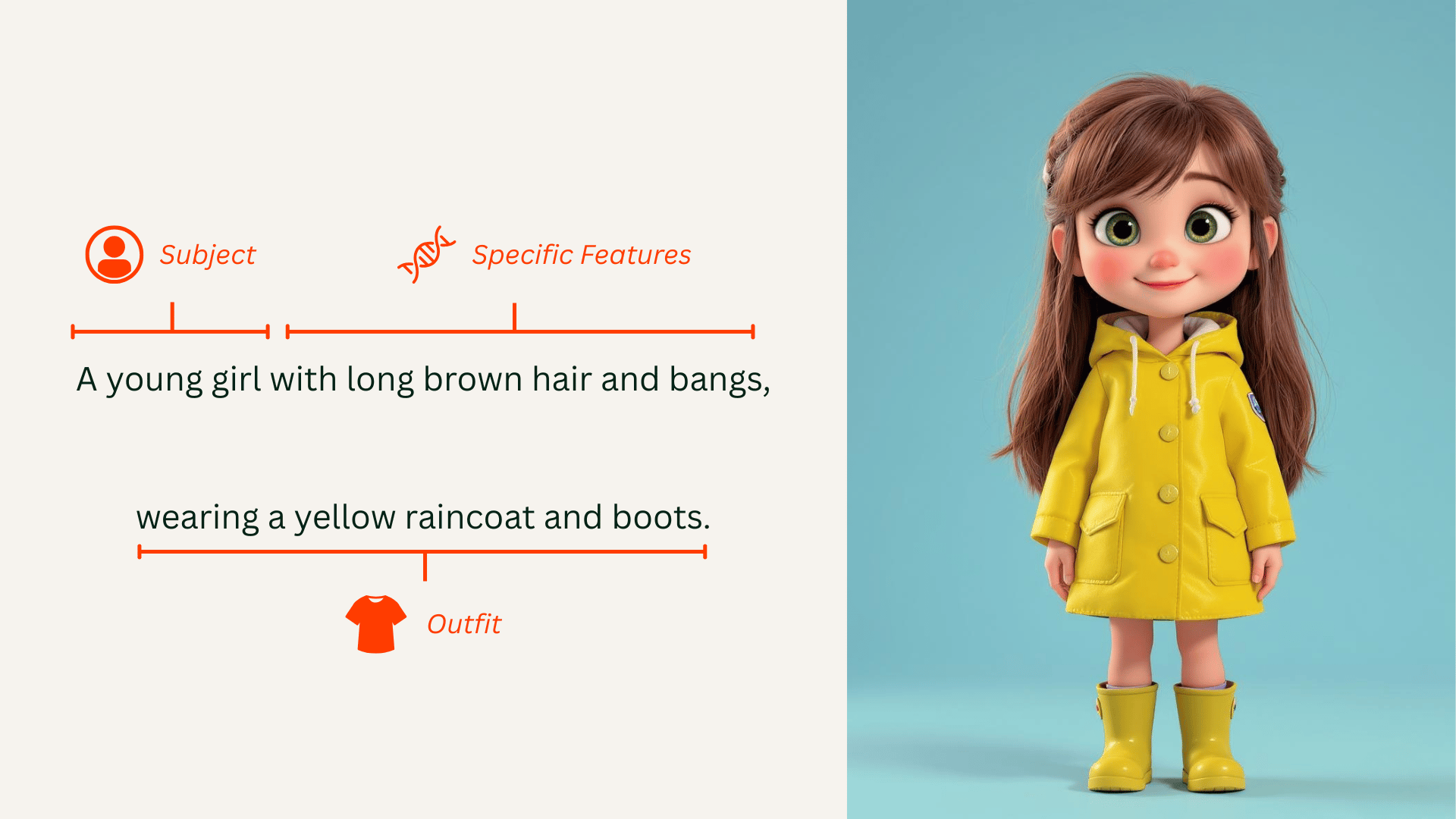 Complete DNA: "A young girl with long brown hair and bangs wearing a yellow raincoat and boots" That's it. Simple beats complex every single time. The Game-Changer: Full-Body Front View StrategyHere's the secret professional illustrators know: Always create your first image as a full-body front view. Always. Why this matters: